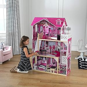 Wooden Dollhouse with Elevator, Balcony and 15-Piece Accessories, Pink, Gift for Ages 3+