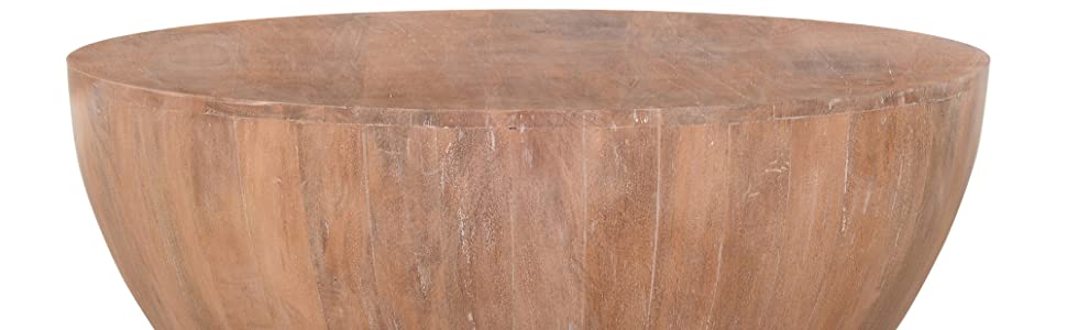 Showcasing a great piece of artistry, this round-shape Coffee Table features a smooth wide top that can be used for serving and displaying various decorative items. This coffee table has a narrow flat base that provides good stability on the ground. The distressed brown finish adds depth to its plank wood texture, transmuting your setting into a casual space. Handcrafted in finest quality mango wood, there may be a variation in color, finish, wood grain and knots due to various natural and artificial factors.