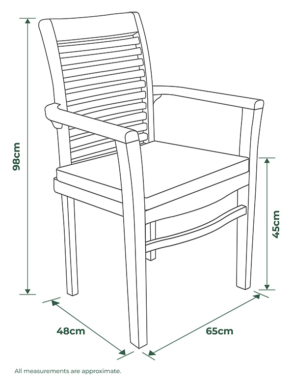 Included with the table come 8 stylish, teak stacking chairs (each with a free cushion) and a parasol..