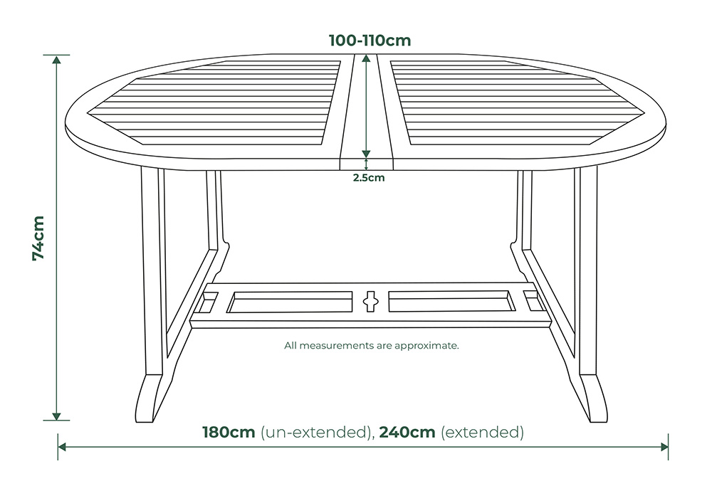 The handsome, extendable, teak table features a 2.5cm deep table top which is 110cm* wide and extends from 180cm to 240cm in length.