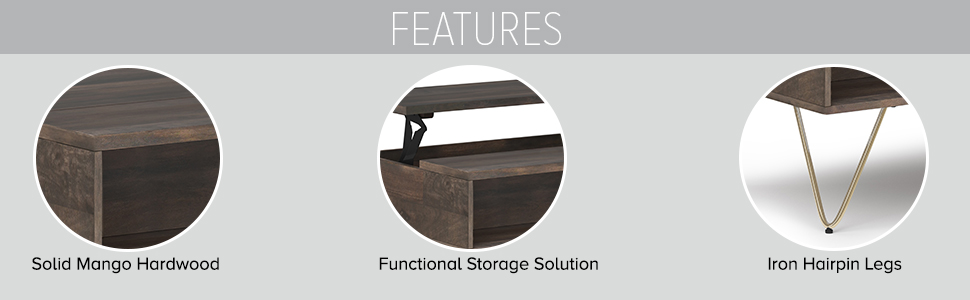 Style and convenience are at work in this uniquely functional Hunter Lift-Top Coffee Table. The top lifts up to reveal hidden storage, pulling toward you for the perfect surface to type on your laptop or eat in front of the television. The table features two open compartments for stacking books or displaying decorative objects. Hairpin legs along with Mango Wood add an industrial component.