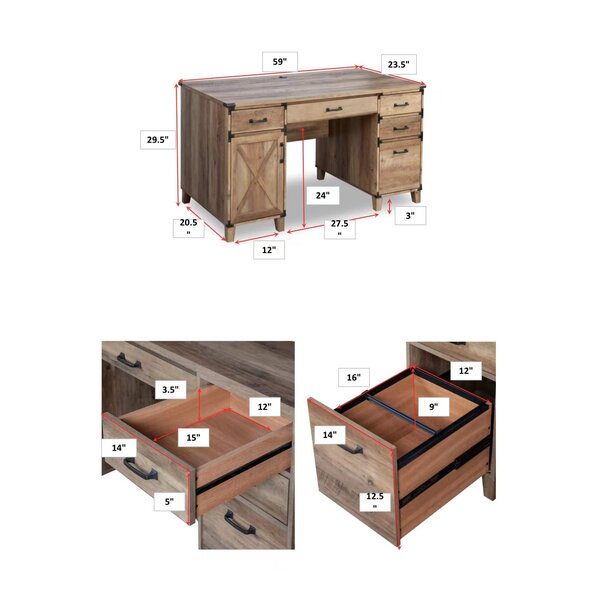 This computer desk offers rustic industrial design at its best. It's made from engineered wood with a rustic oak finish that brightens your space and brings casual, yet elevated warmth to your space. Ample storage comes in the form of one enclosed cabinet with two interior shelves, three drawers, and one file drawer that includes a hanging bar for convenient document filing. There's also a keyboard sliding drawer to hold your laptop, plus cable management cutouts for added organization. Black steel drawer handles and hinges add contrast against the wood, while the X-cross wood details add a textured design element.